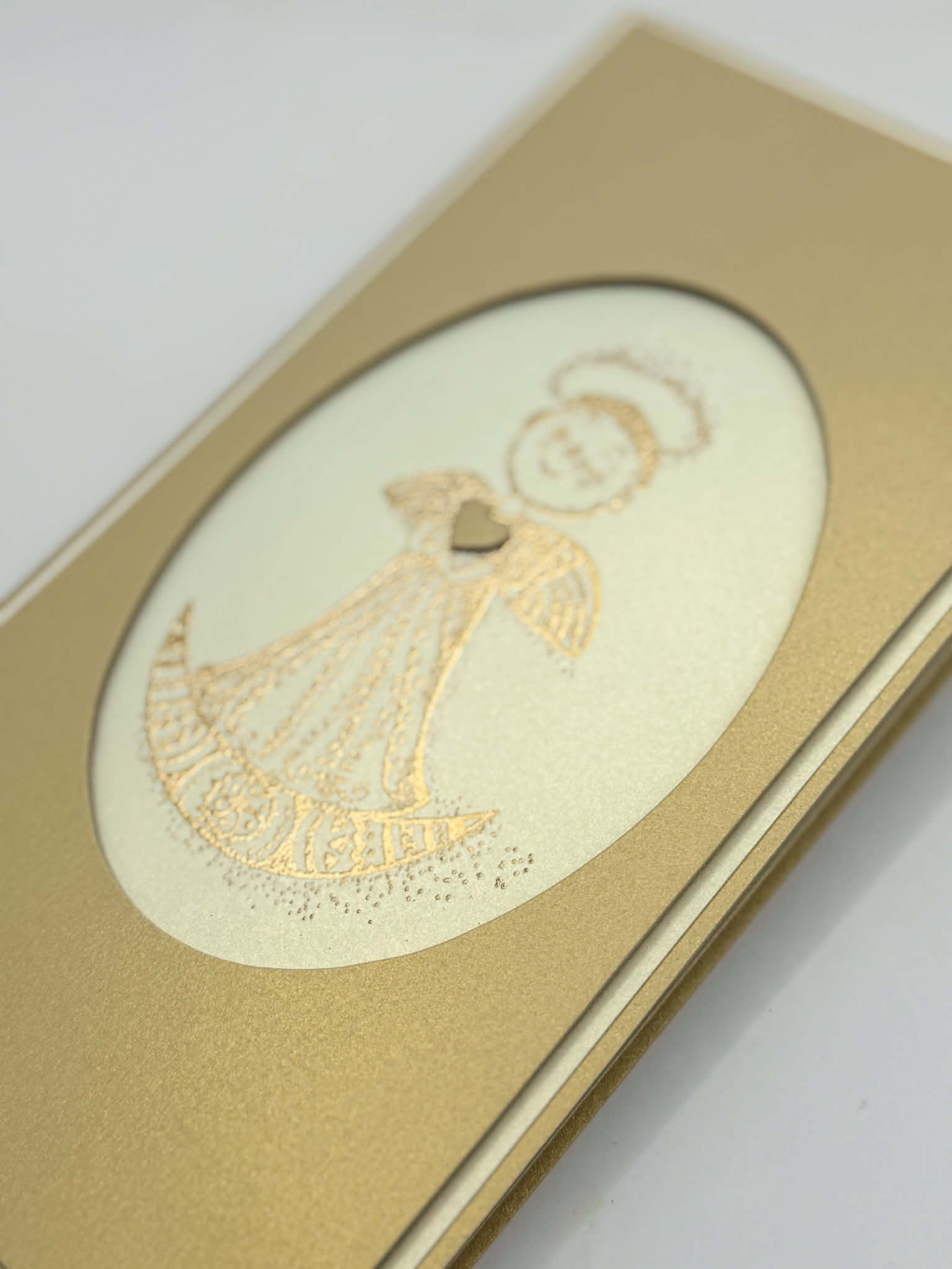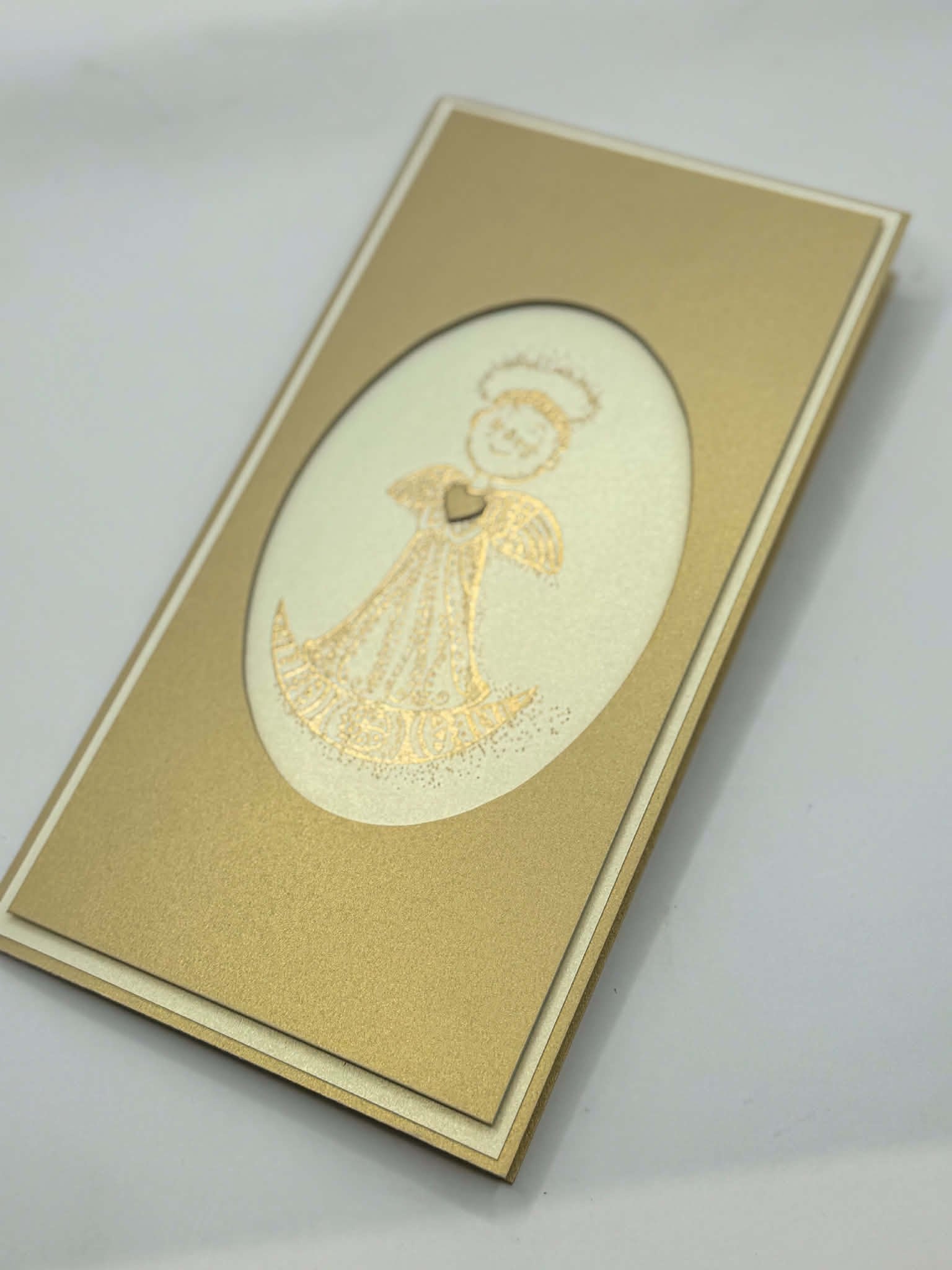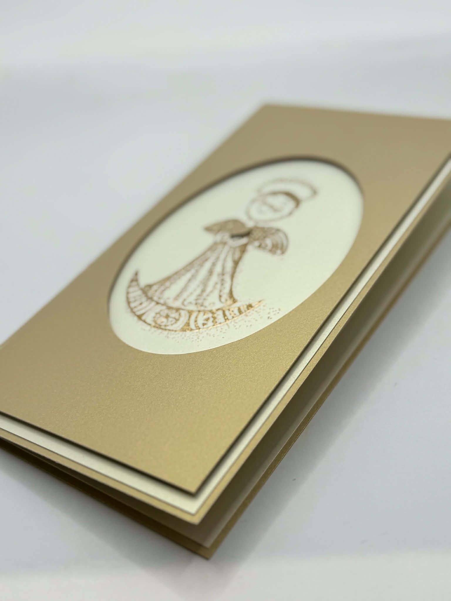 A timeless and elegant handcrafted card in warm cream and gold tones, featuring a refined angel motif with delicate metallic detailing. Its classic design makes it a perfect choice for baptisms, confirmations, and other special occasions.