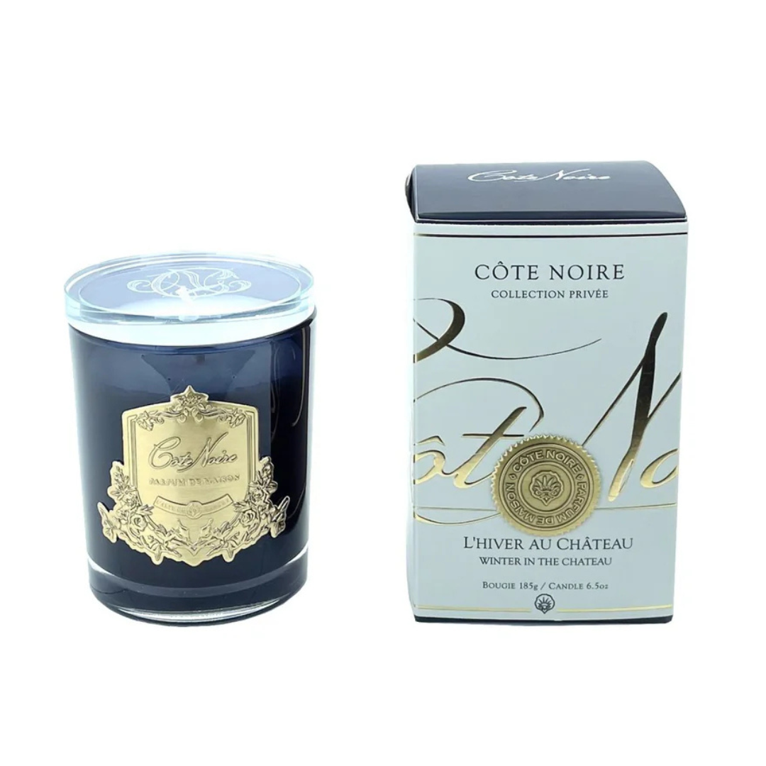 Cote Noire Candles – Dark Vessel with Gold Badge – Winter in the Chateau