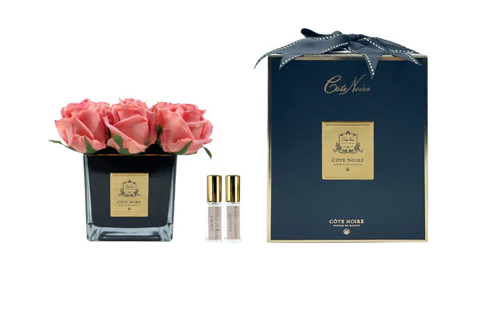 Each life-like perfumed 9 rose bud arrangement has been skilfully hand crafted and is set in gel giving it the appearance of water. Each petal has a special natural coating to give them a true to life touch and appearance. Arranged in a clear square vase with a gold signature Cote Noire Badge.
