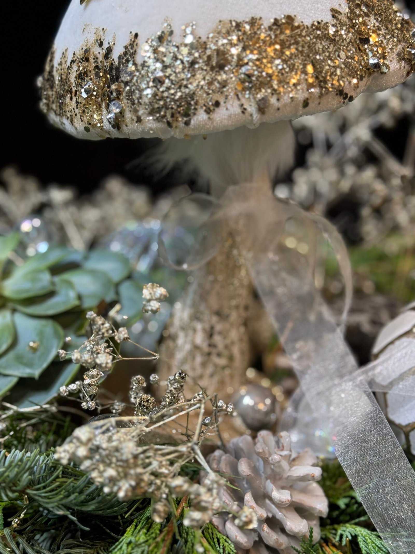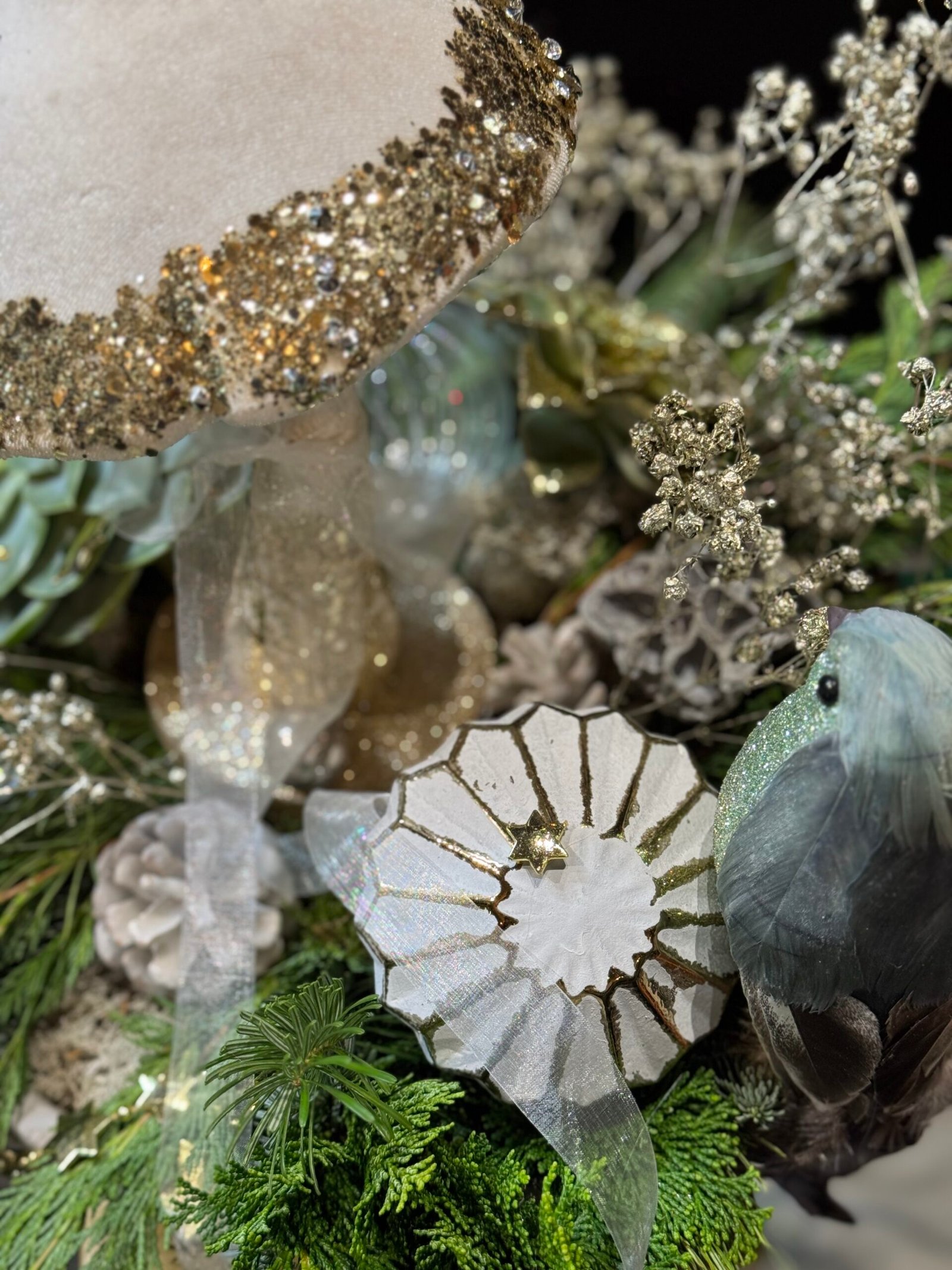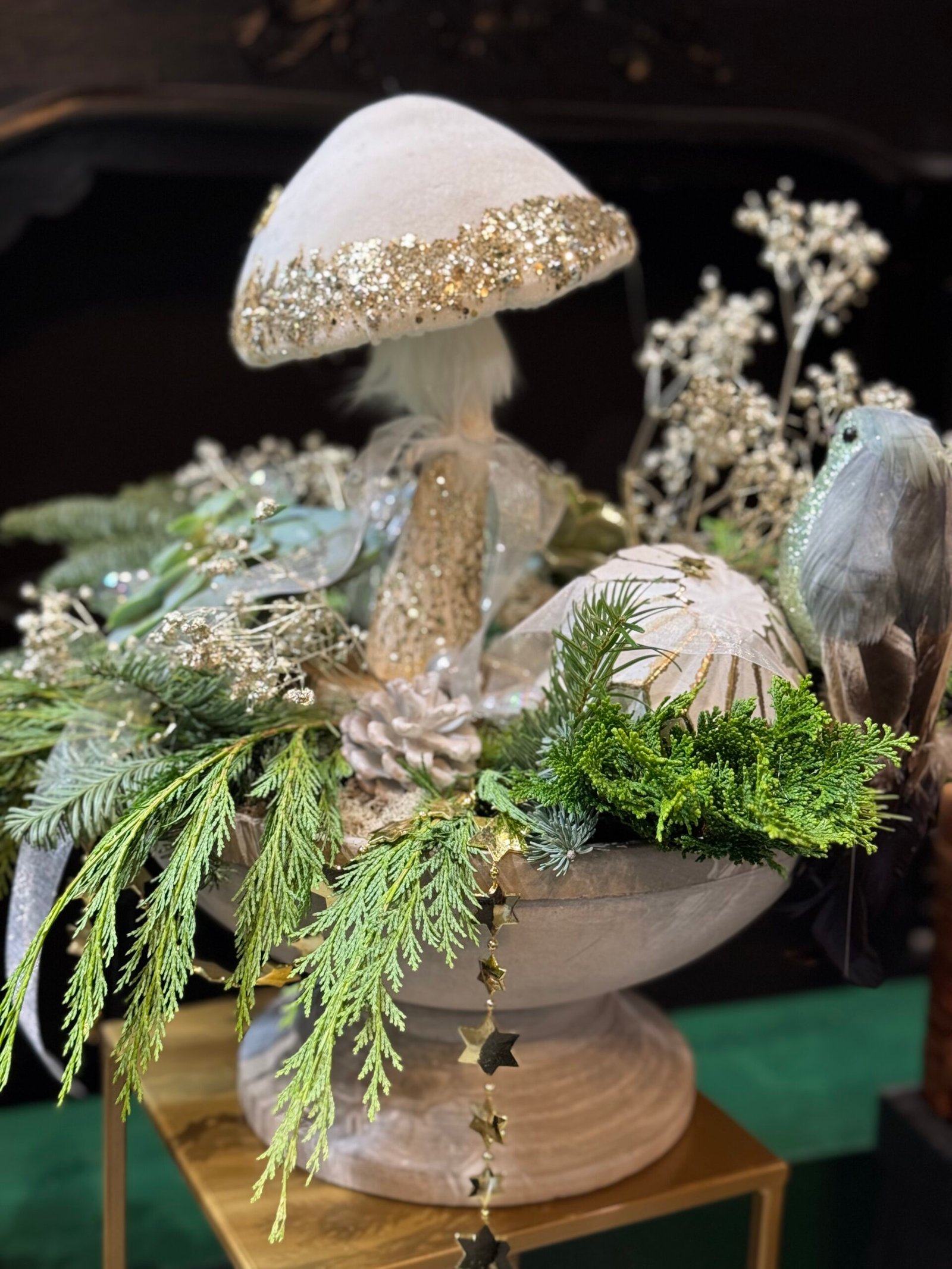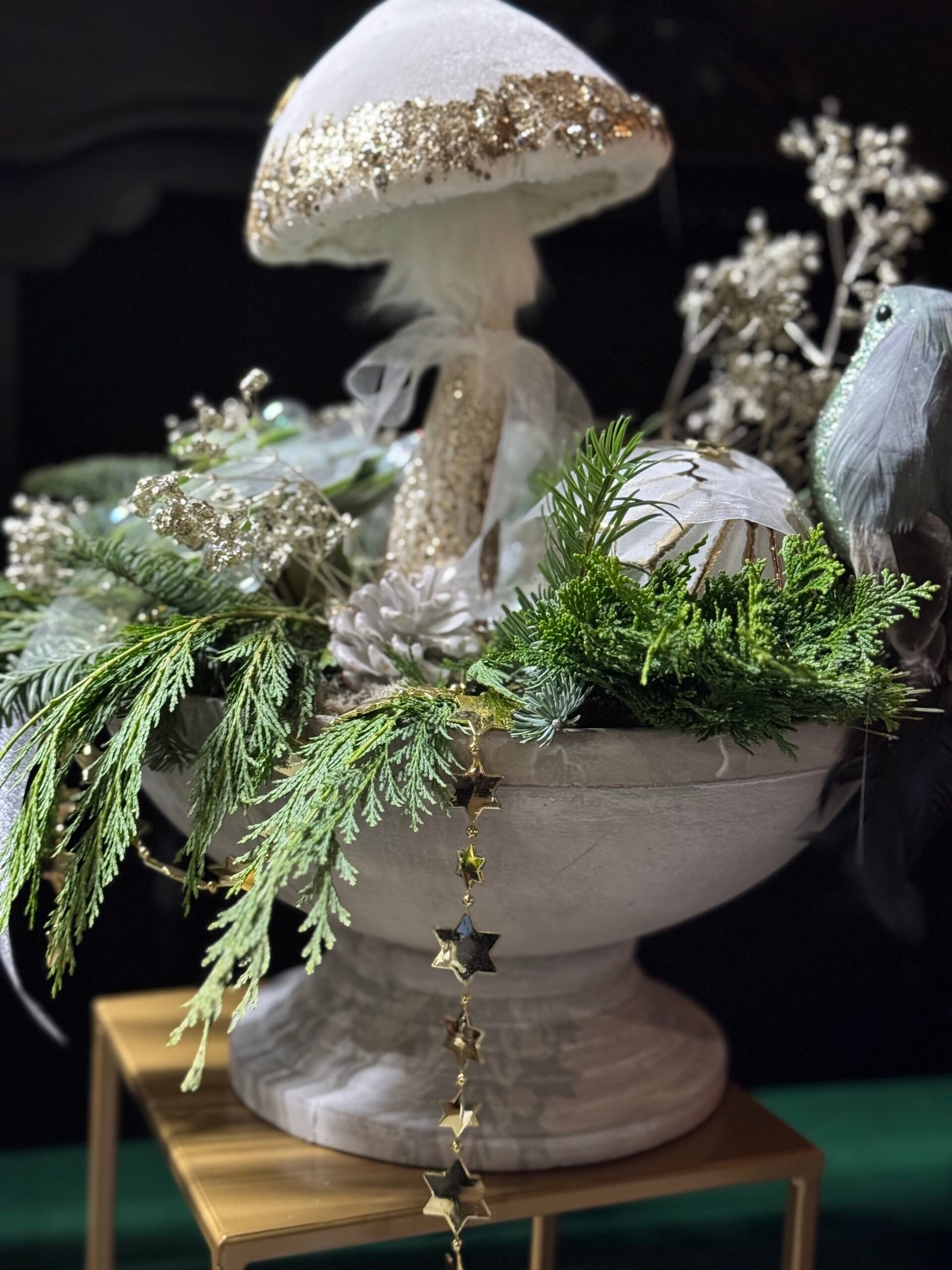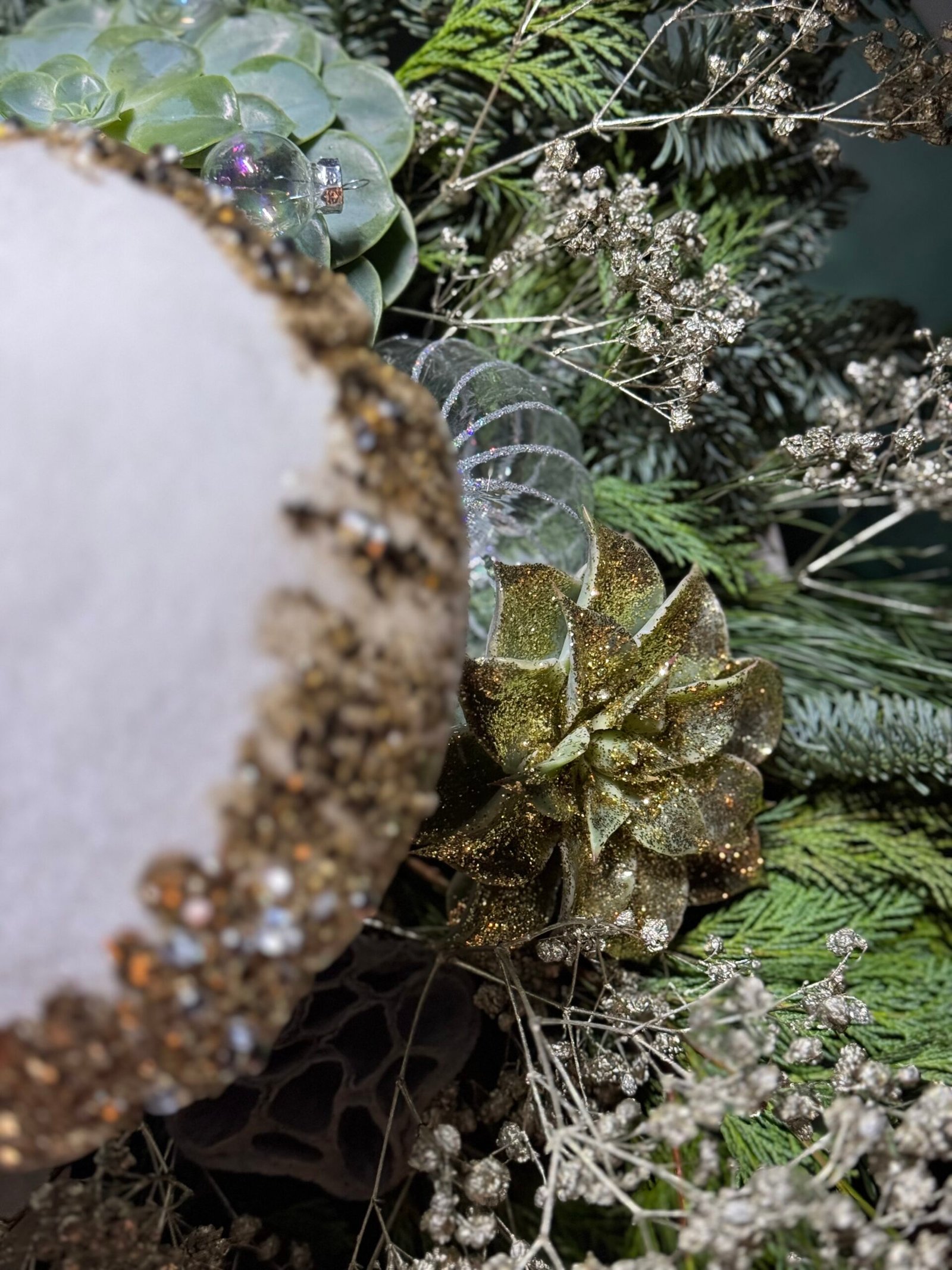 Shiny and elegant Christmas decoration “Magic Forest”. Composition made in concrete pot, decorated with natural greens, succulents and glass ornaments.