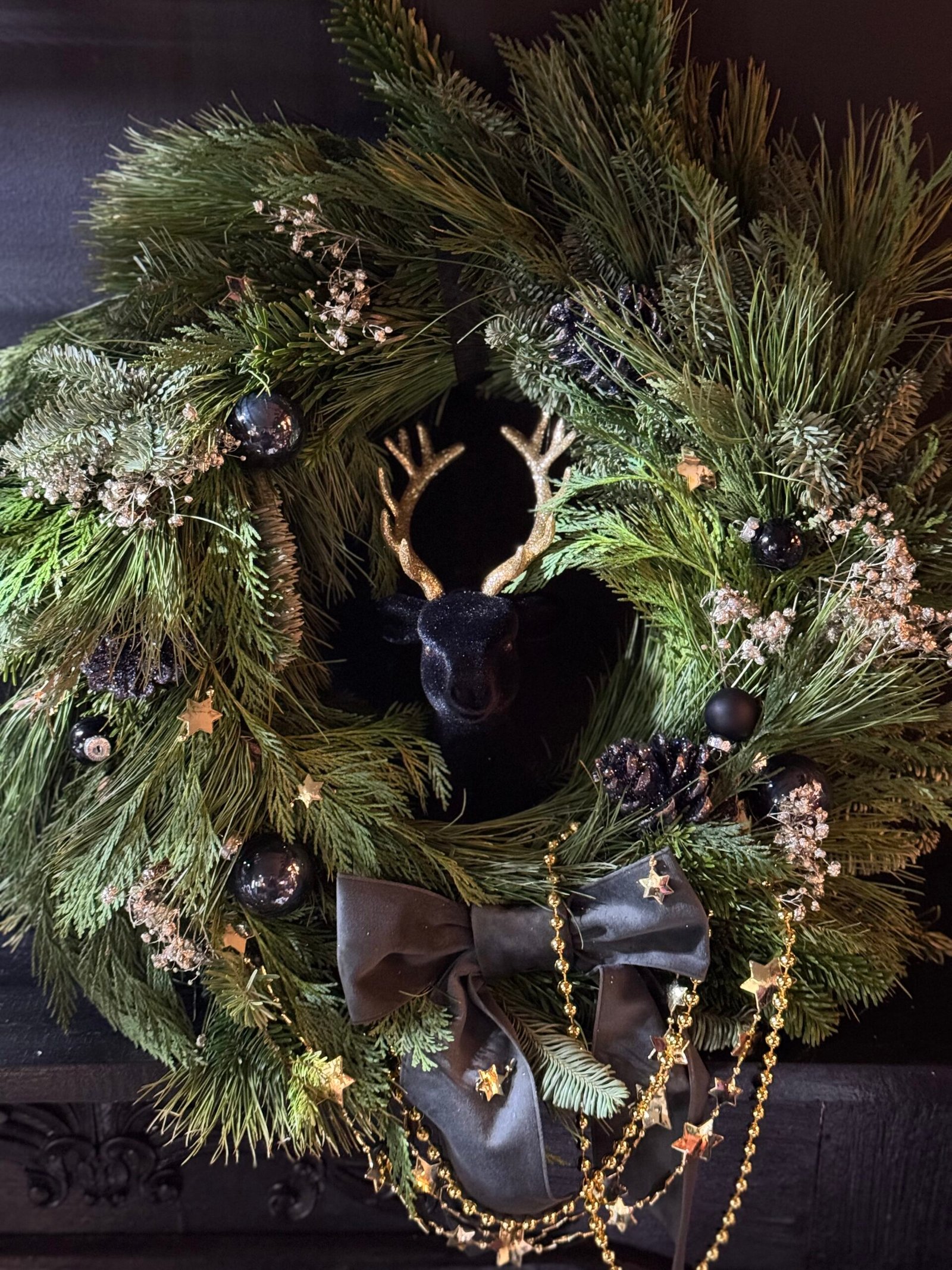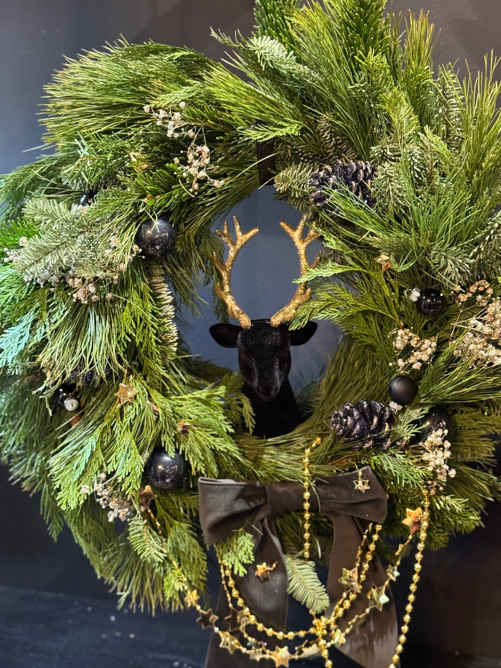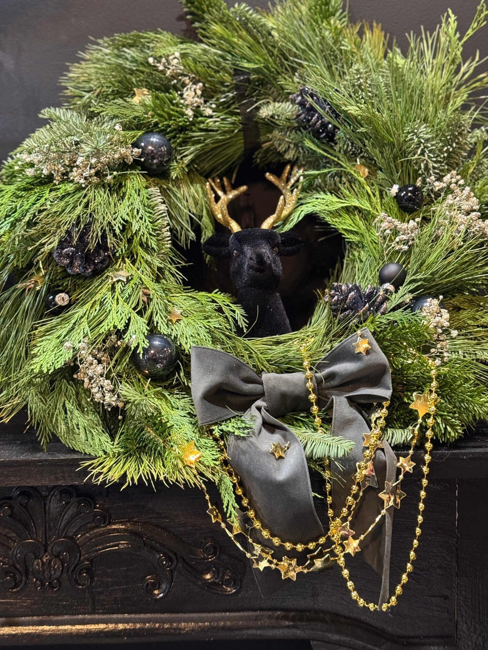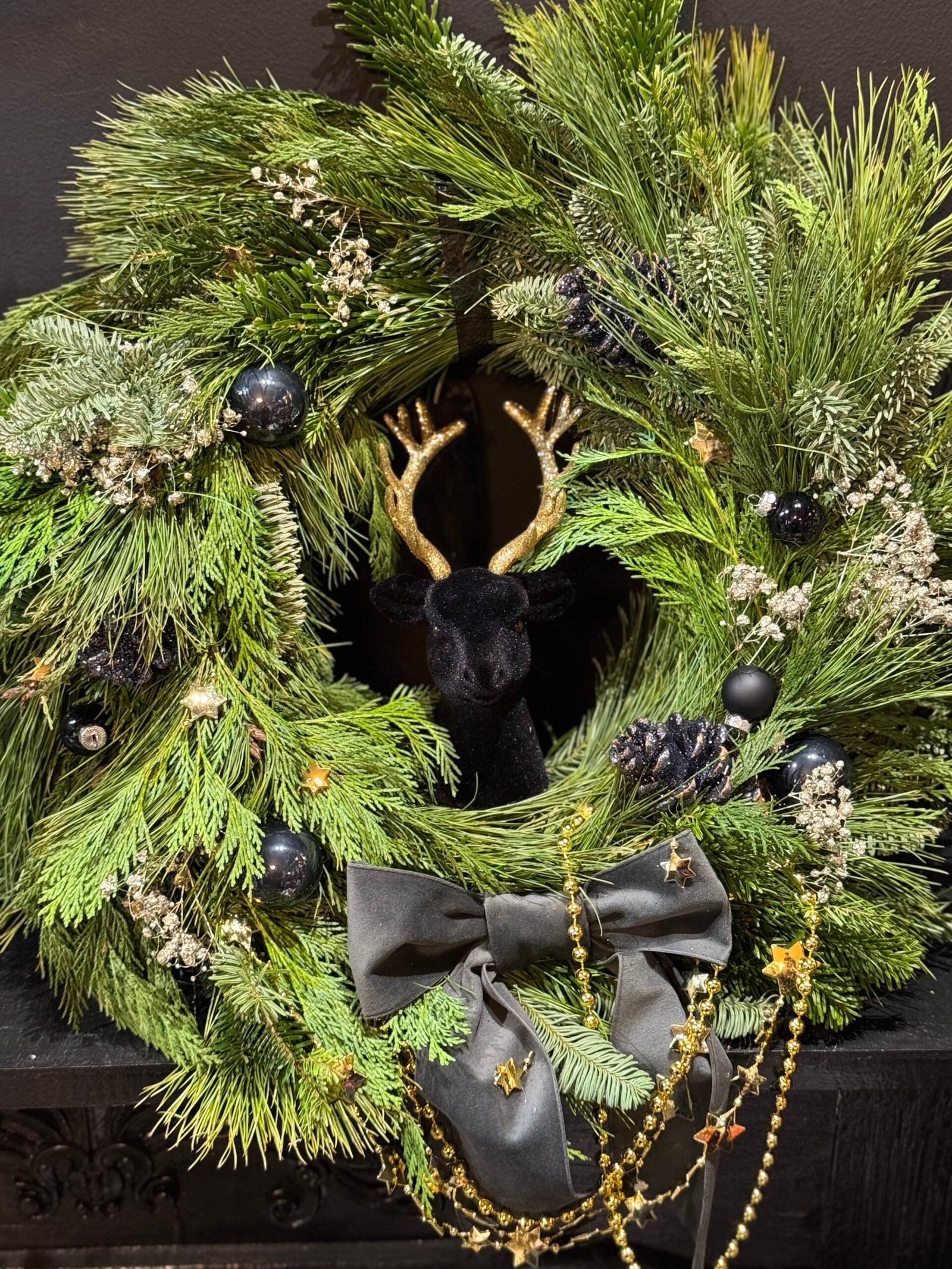 Hanging Christmas door wreath. Made with natural greens. Decorated with black, gold decorations. Perfect for those who is looking exceptional and unique design. Diameter 50cm