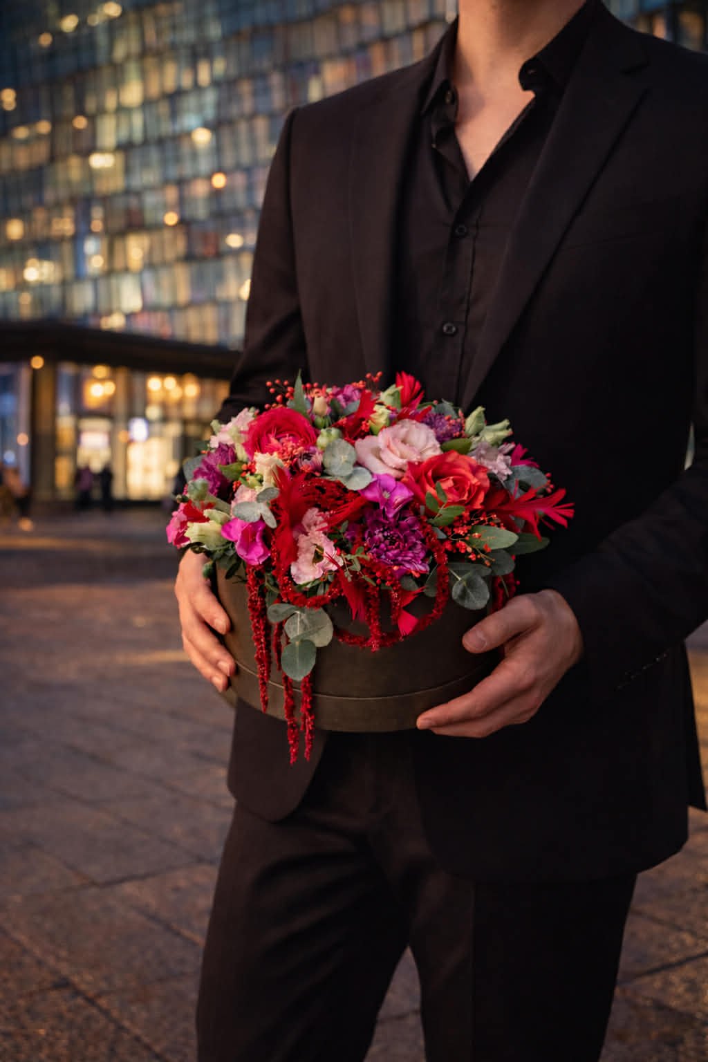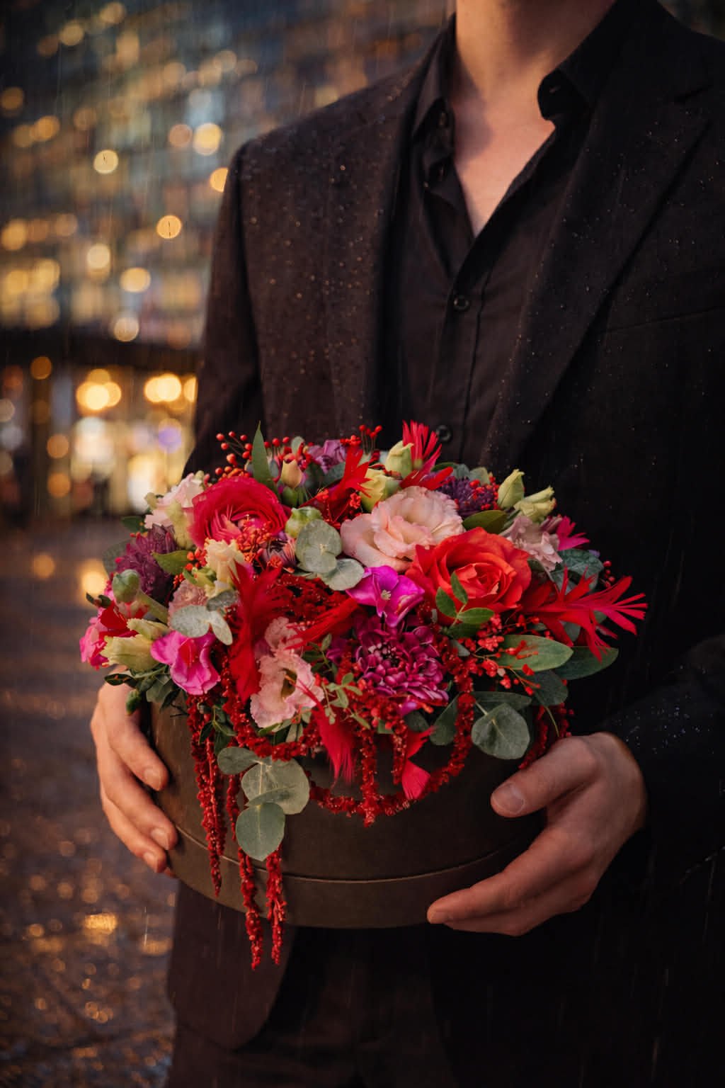 A striking flower box overflowing with rich reds, vibrant pinks, and luxurious textures. Love in Bloom is a bold expression of passion and romance, available in M, L, and XL sizes.