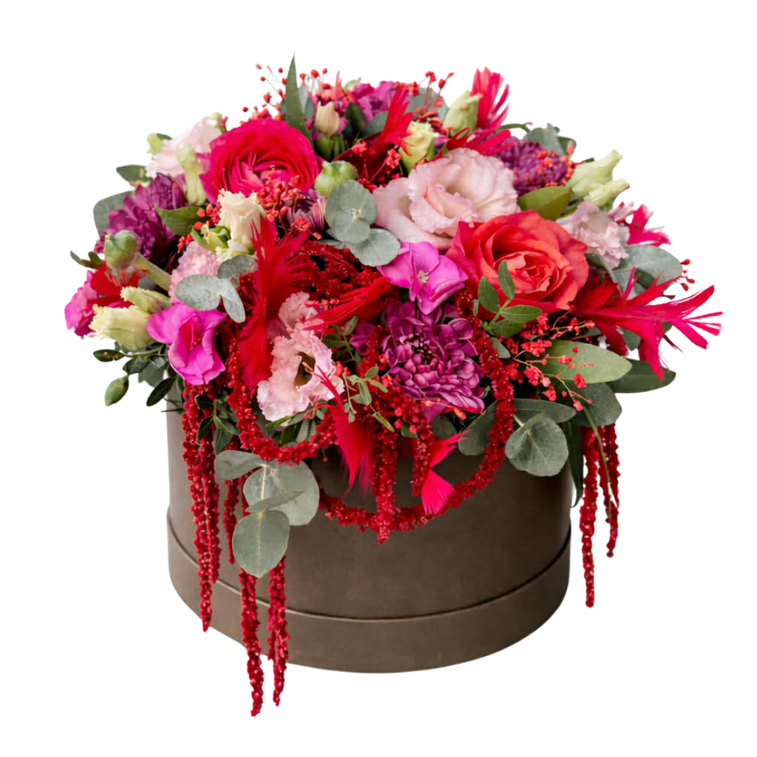 Love in Bloom is a captivating flower box designed to make a powerful statement of love. This lush arrangement blends velvety red and coral roses with soft blush blooms, dramatic seasonal flowers, and cascading red accents that add depth, movement, and intensity. Finished with fresh eucalyptus and refined greenery, the composition feels abundant, expressive, and undeniably luxurious.