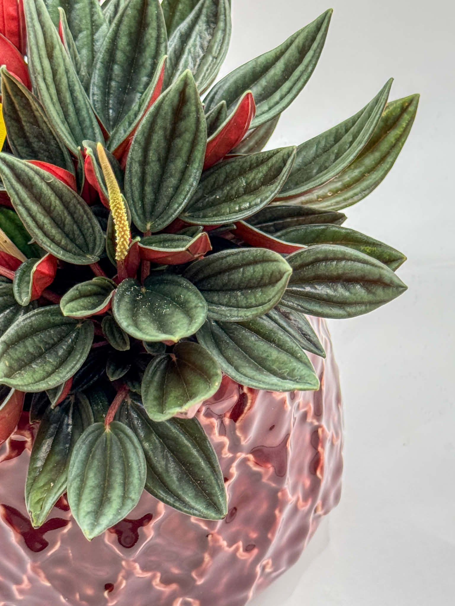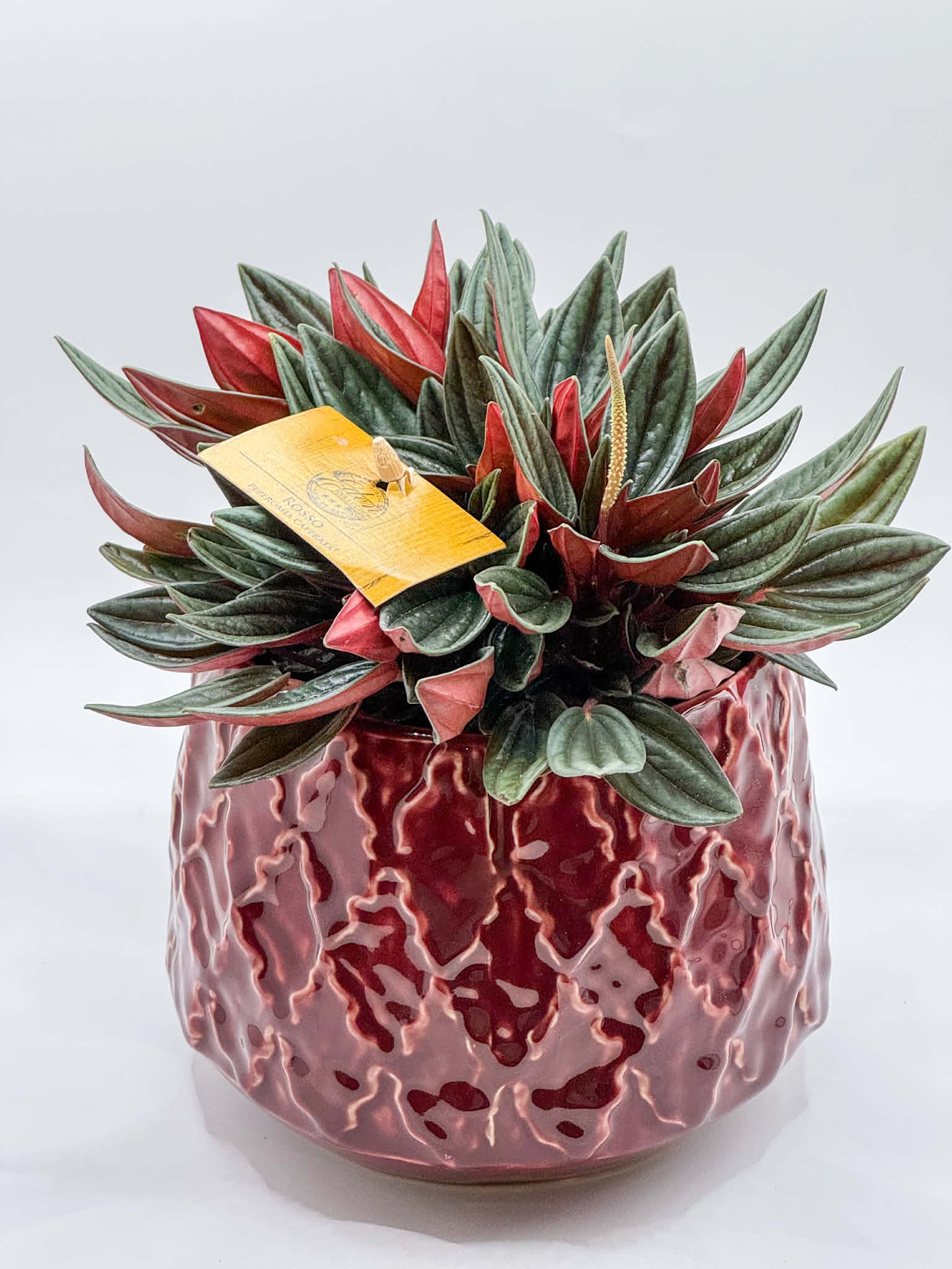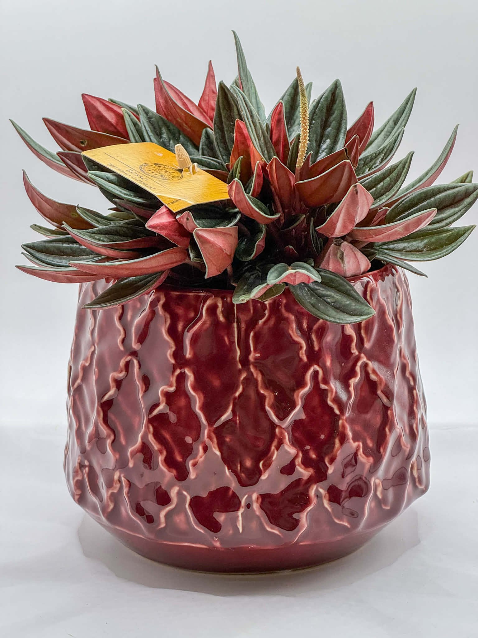A lush and elegant Peperomia Caperata presented in a textured ceramic pot with warm, rich tones. Its deep green and burgundy leaves create a sophisticated, modern look—perfect for adding a touch of style to any interior.