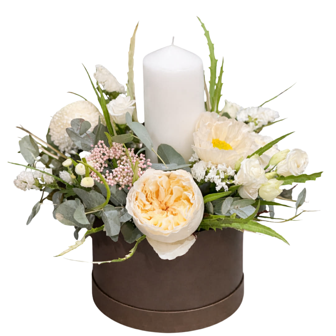 Cream garden roses, delicate ranunculus, and seasonal white blooms are carefully arranged around a simple white candle, symbolizing light, hope, and enduring memory.