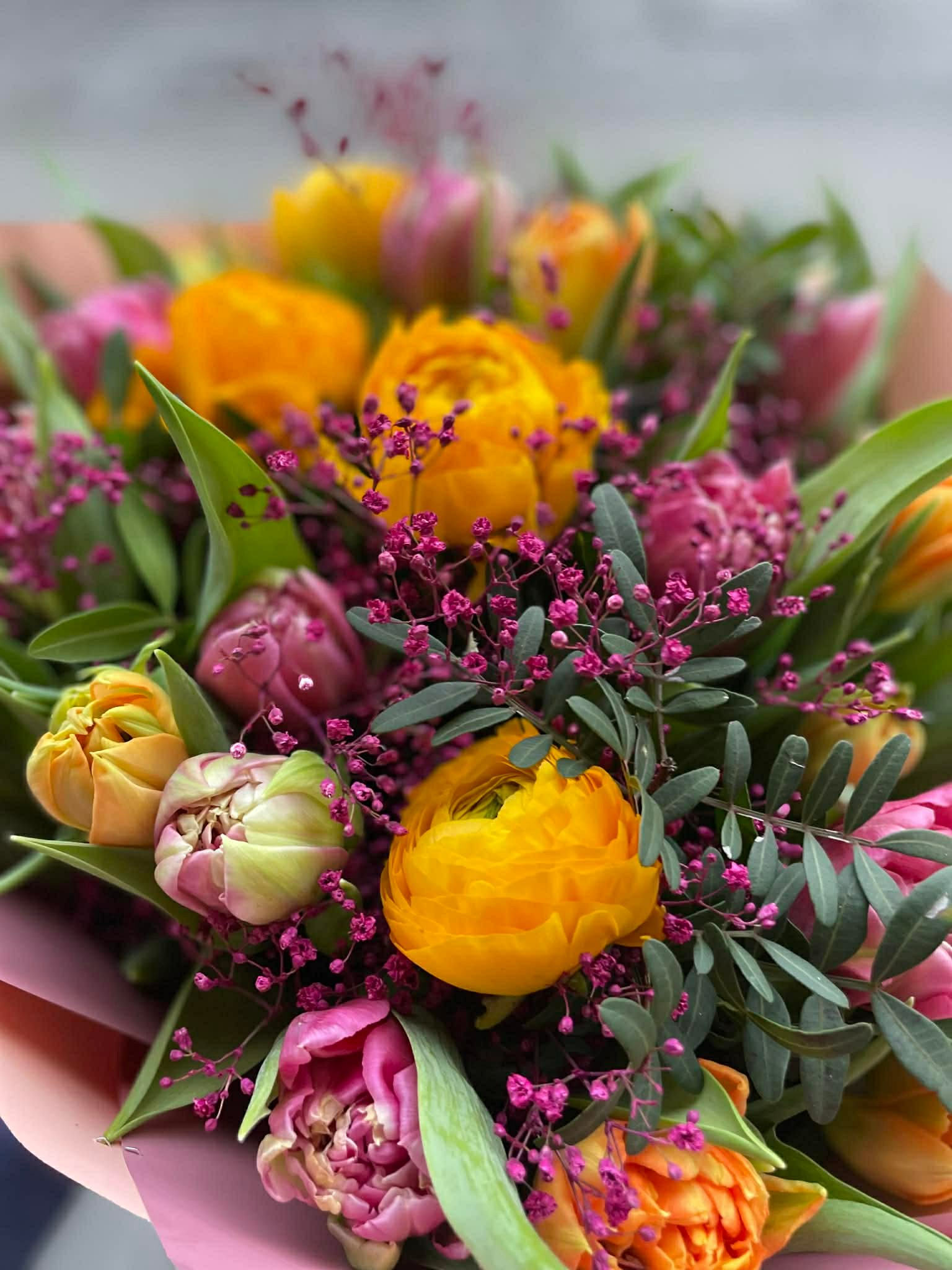 A joyful celebration of spring in full bloom. This bouquet brings together elegant tulips with a vibrant mix of seasonal flowers, creating a rich, textured arrangement full of colour and life.