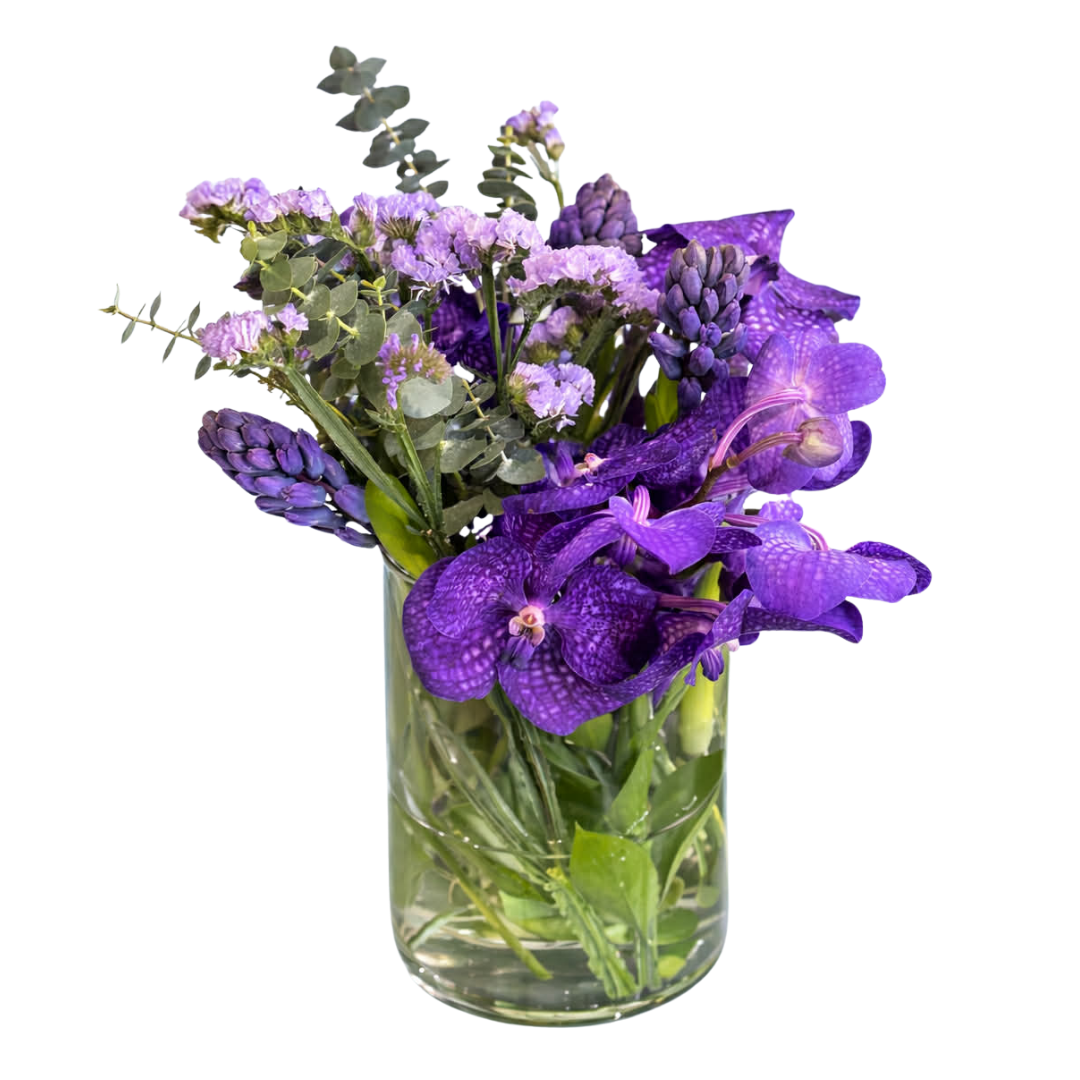 A limited Women’s Day bouquet inspired by the quiet beauty and depth found in her eyes. Rich violet tones take centre stage in this elegant arrangement, featuring striking purple orchids, fragrant hyacinths, delicate statice, and fresh eucalyptus greenery.